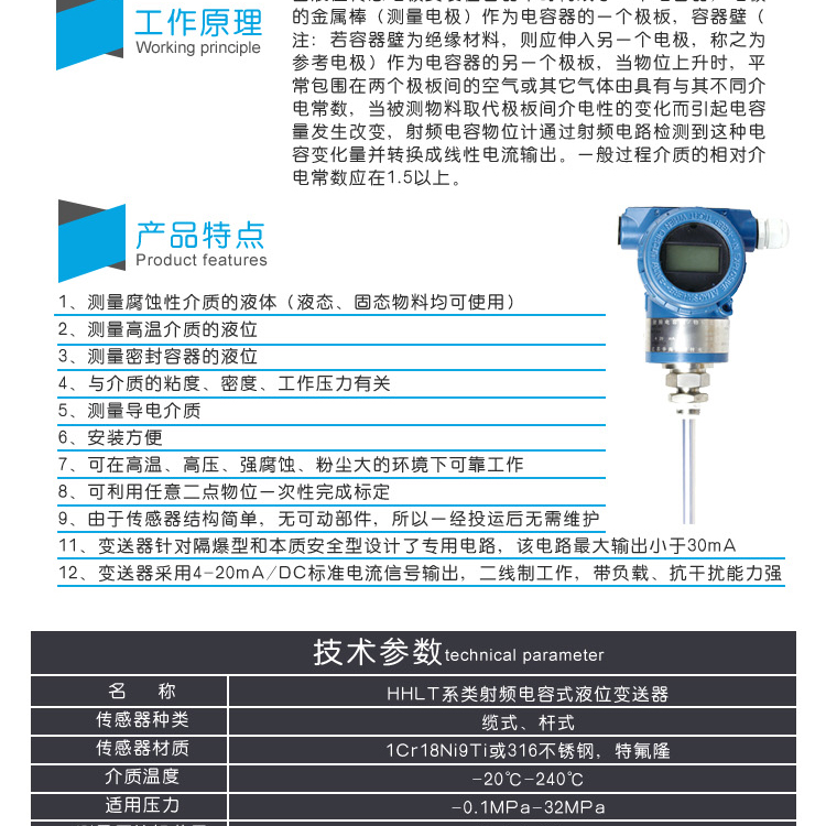 采用射頻技術(shù)和微機技術(shù)解決了傳統(tǒng)電容式物位計溫漂大、標(biāo)定難、怕粘附的難題,可廣泛應(yīng)用于各種液體固體物位及界面的連續(xù)測量