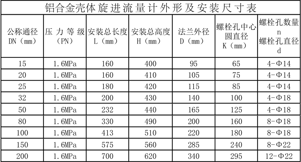 1.鋁合金殼體旋進流量計外形尺寸(表2)