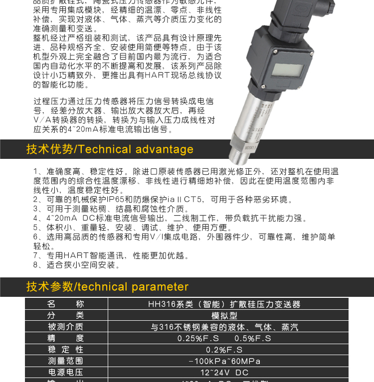 穩(wěn)定性好;可靠的機械保護(hù)IP65和防爆保護(hù)iaⅡCT5,可用于各種惡劣環(huán)境;可用于測量粘稠、結(jié)晶和腐蝕性介質(zhì);4~20mA DC標(biāo)準(zhǔn)電流信號輸出,二線制工作,帶負(fù)載抗干擾能力強。