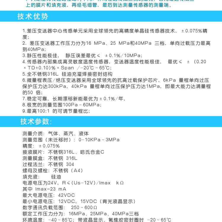 微量程表壓/絕壓變送器采用************的抗高過(guò)載保護(hù)芯片,6kPa 量程單向過(guò)壓保護(hù)壓力達(dá)300kPa,40kPa 量程單向過(guò)壓保護(hù)壓力達(dá)1MPa,能力達(dá)滿量程的50 倍,穩(wěn)定可靠,長(zhǎng)期漂移新能******為±0.1%/年,極寬的測(cè)量范圍100Pa~60MPa,最高100:1 的可調(diào)節(jié)量程比。